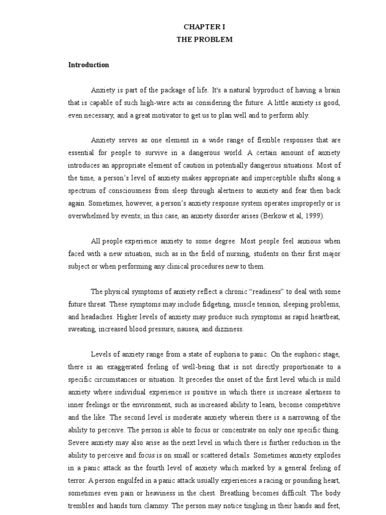 · Thesis: In this paper, there is a discussion on different types of psychological disorders that are characterized by fear and apprehension and their treatment options. Body Paragraphs Anxiety disorders are described by intemperate and industrious dread and tension, and by related unsettling influences in conduct Anxiety is a normal reaction to certain situations. A small level of anxiety is normal, but severe anxiety can be a serious problem. Academic anxiety can become more detrimental over time. As a student’s academic performance suffers, the anxiety level related to certain academic tasks increases (Huberty, ) Managing Thesis Anxiety: A Faculty-Librarian Partnership to Guide Off-Campus Graduate Education Students Through the Thesis Process Rosemary Green and Mary Bowser Shenandoah University ABSTRACT Estimated Reading Time: 6 mins